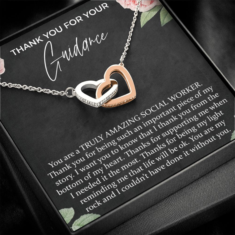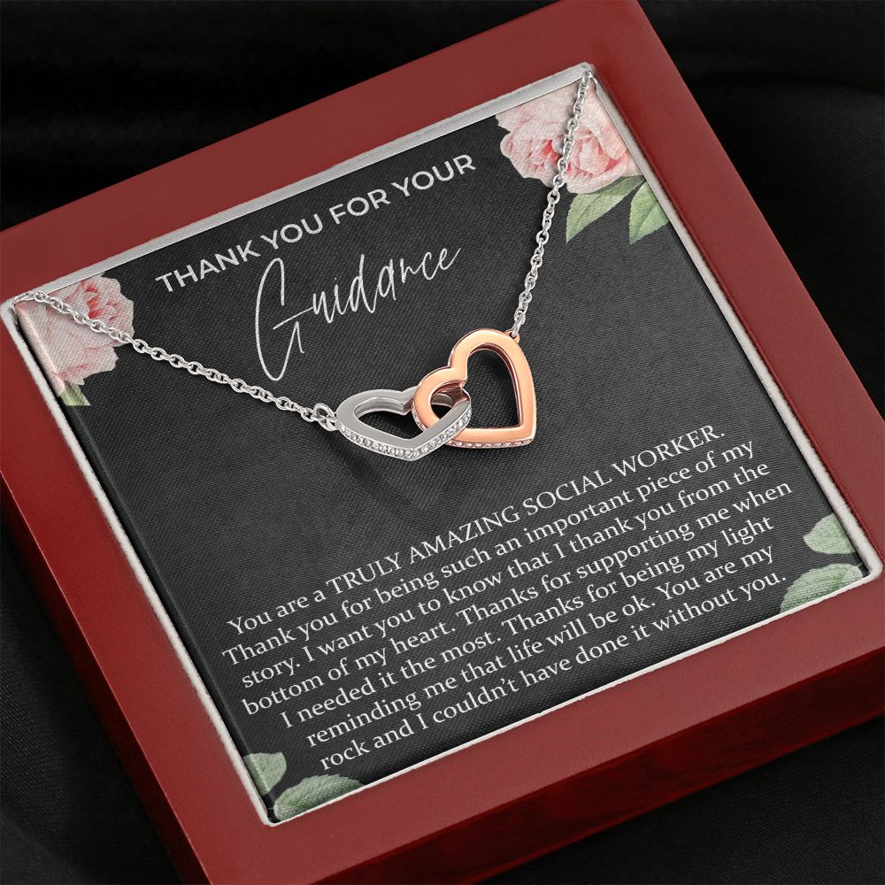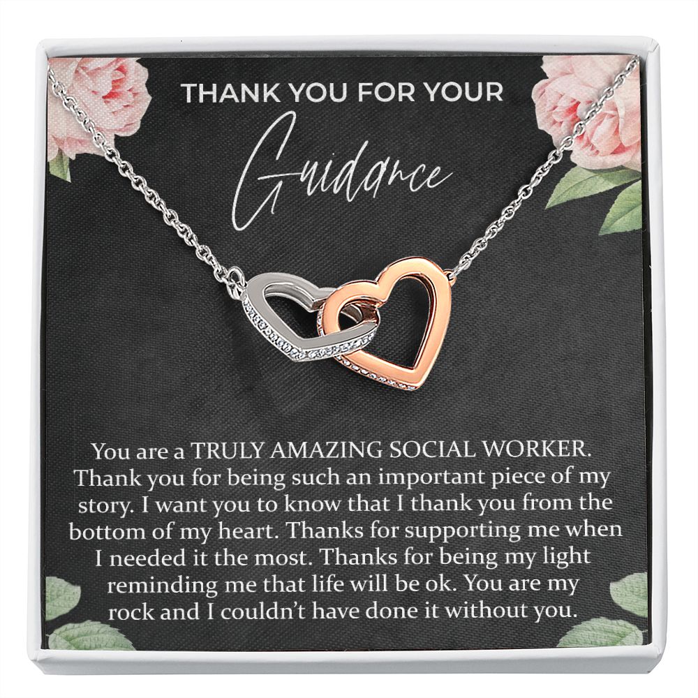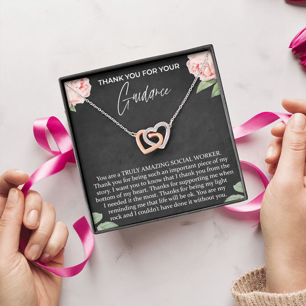 Express gratitude to your social worker and thank them for their guidance with this interlocking hearts necklace. This dazzling pendant features two hearts crafted with polished stainless steel and rose gold or an 18K yellow gold finish embellished with cubic zirconia crystals. The intertwined hearts represent adoration and unity - an eternal bond between two souls. Surprise them with this perfect and meaningful gift today!