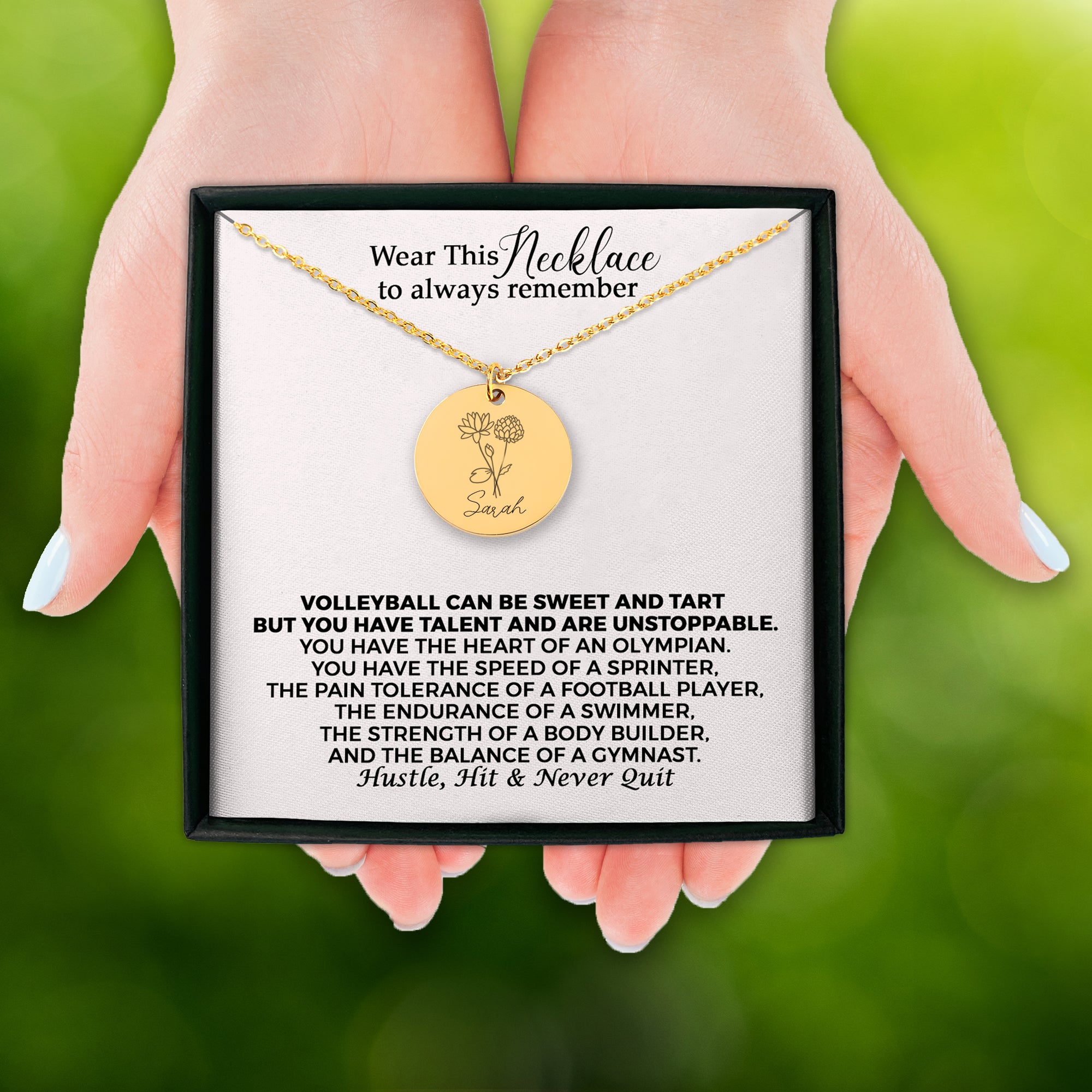 Show your support to your volleyball enthusiast loved one with this Personalized Combined Birth Flower Necklace. This stainless steel necklace is available in three colors: Gold, Silver, and Rose Gold plating with an engravable pendant with a name and bouquet flower symbolizing different emotions and celebrating them.