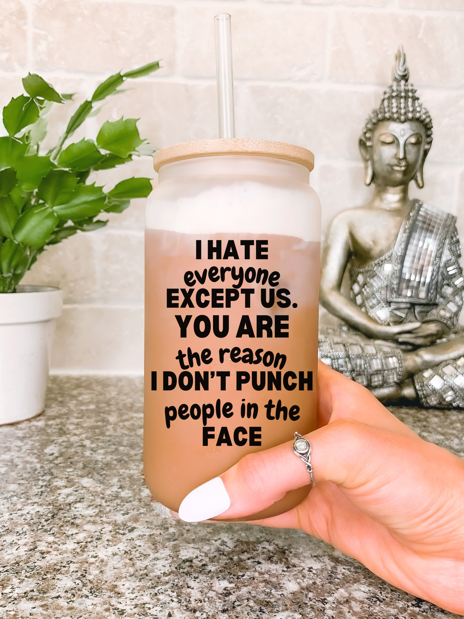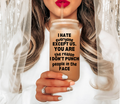 Introducing our I Hate Everyone Except Us Glass Mug Tumbler, available in 16oz size.
