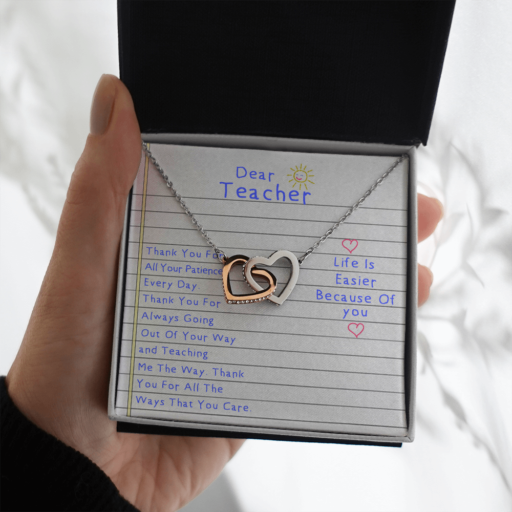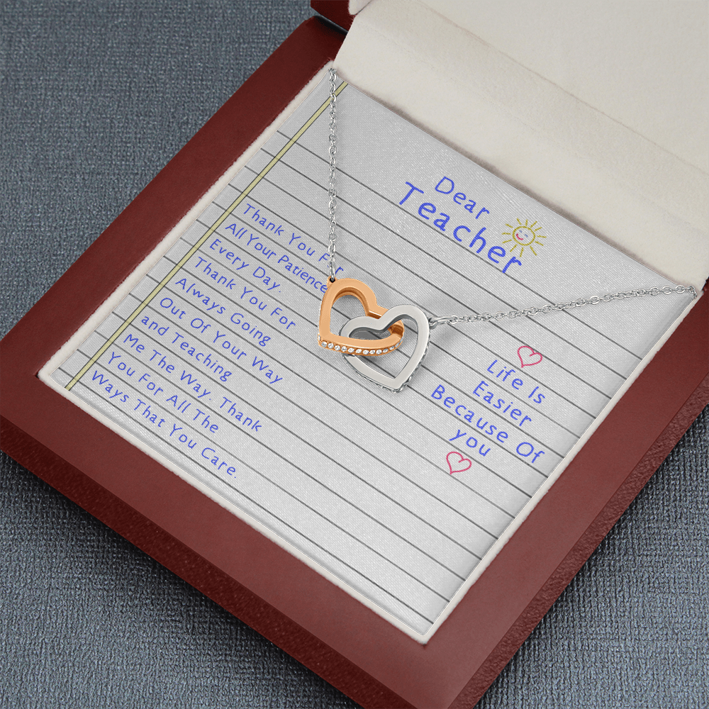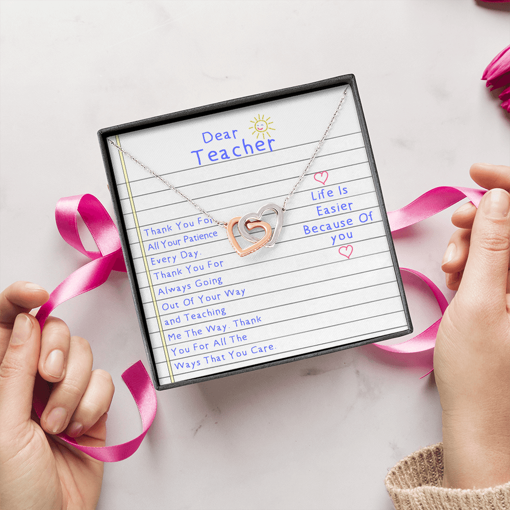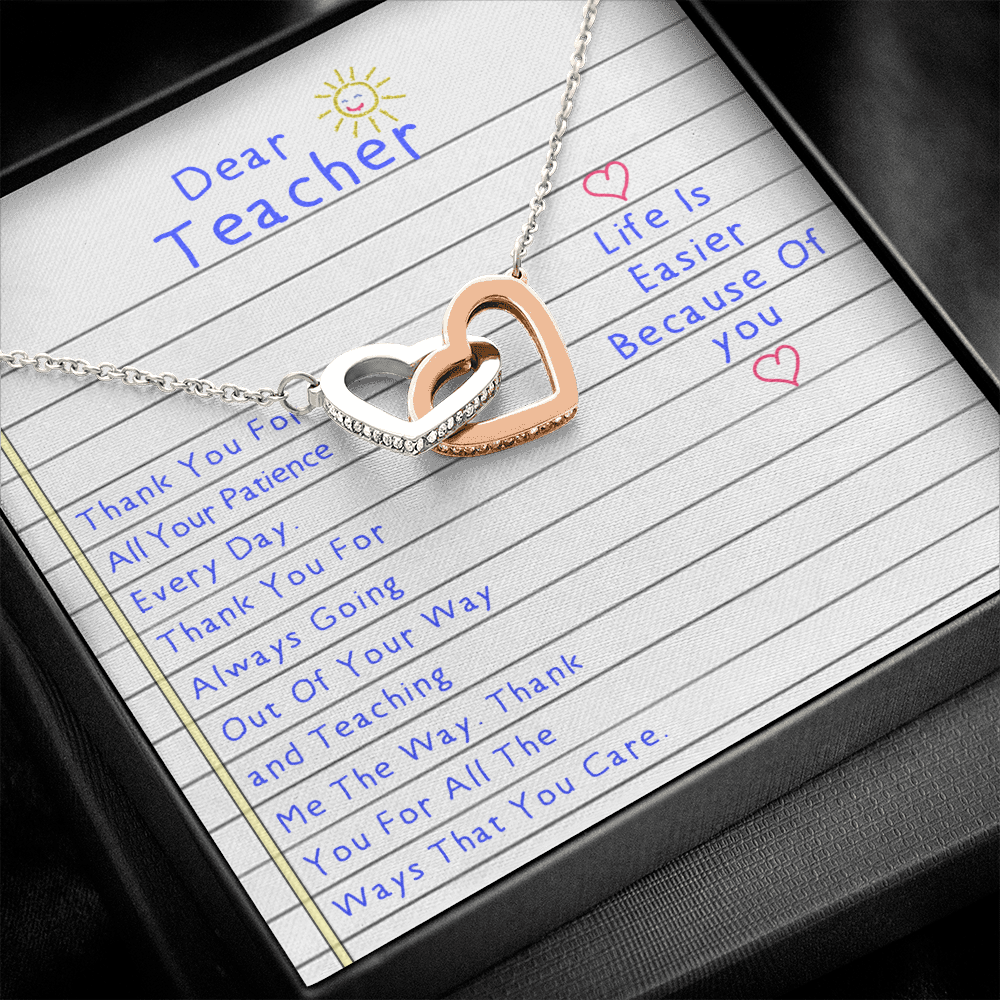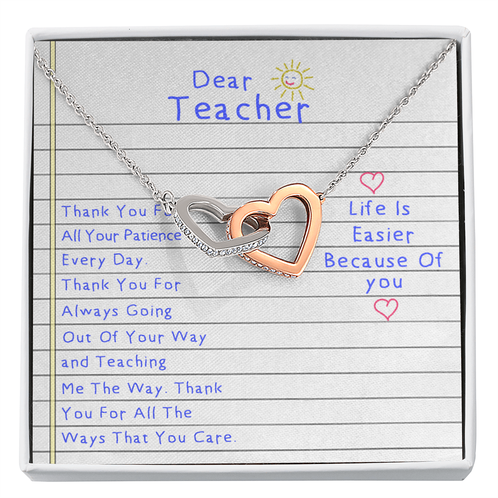 Dear Teacher Life Is Easier Because Of You Interlocking Hearts Necklace | Thank You Gift for Teacher | Preschool Teacher Gift | Gift for Caregiver | Daycare Teacher Appreciation Gift