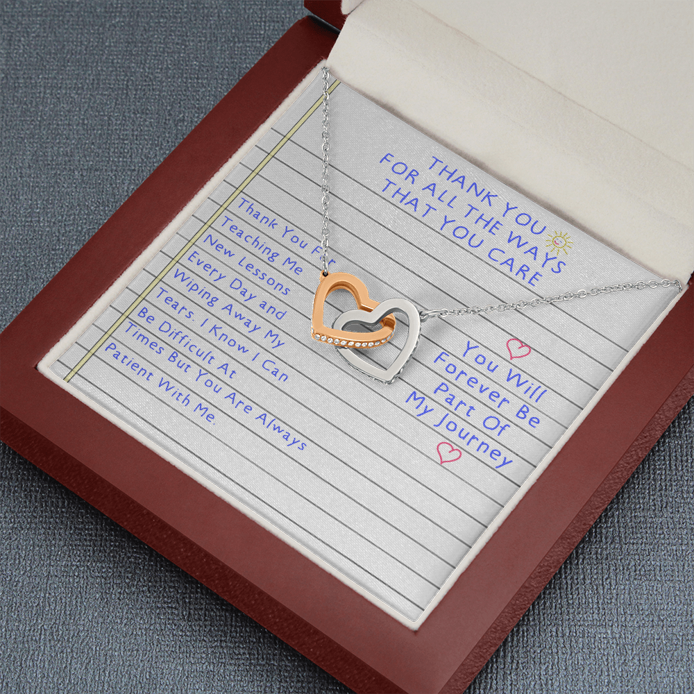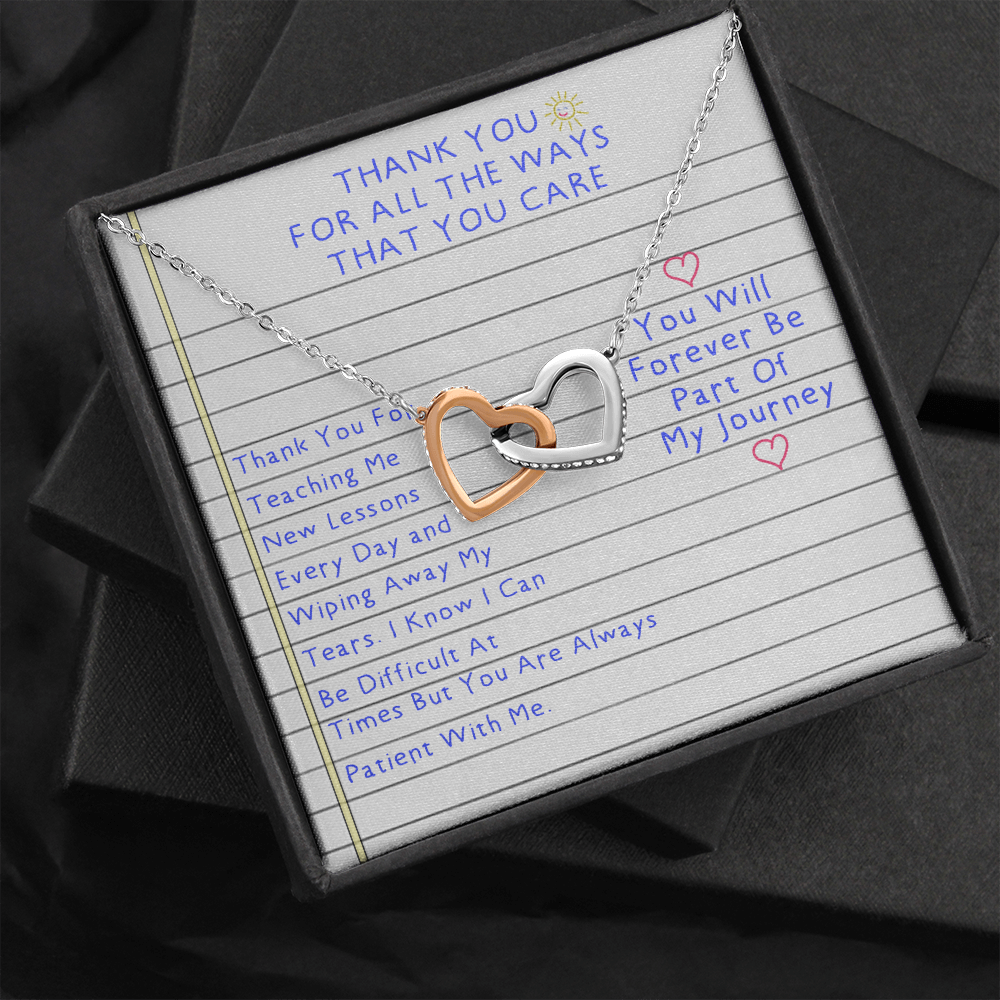 Remind your caregiver how thankful you are for being so patient with this interlocking hearts necklace. This dazzling pendant features two hearts crafted with polished stainless steel and rose gold or an 18K yellow gold finish embellished with cubic zirconia crystals. The intertwined hearts represent adoration and unity - an eternal bond between two souls. Surprise them with this perfect and meaningful gift today!