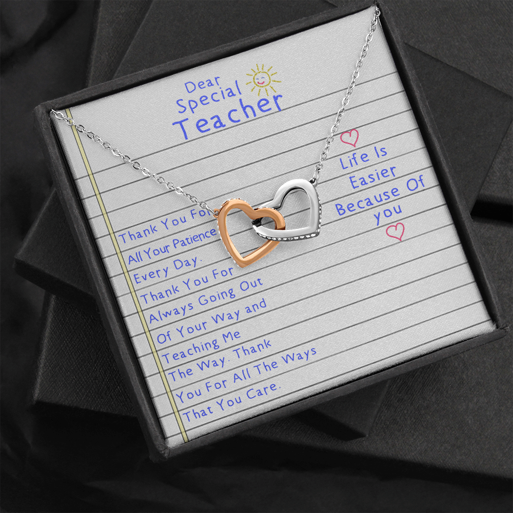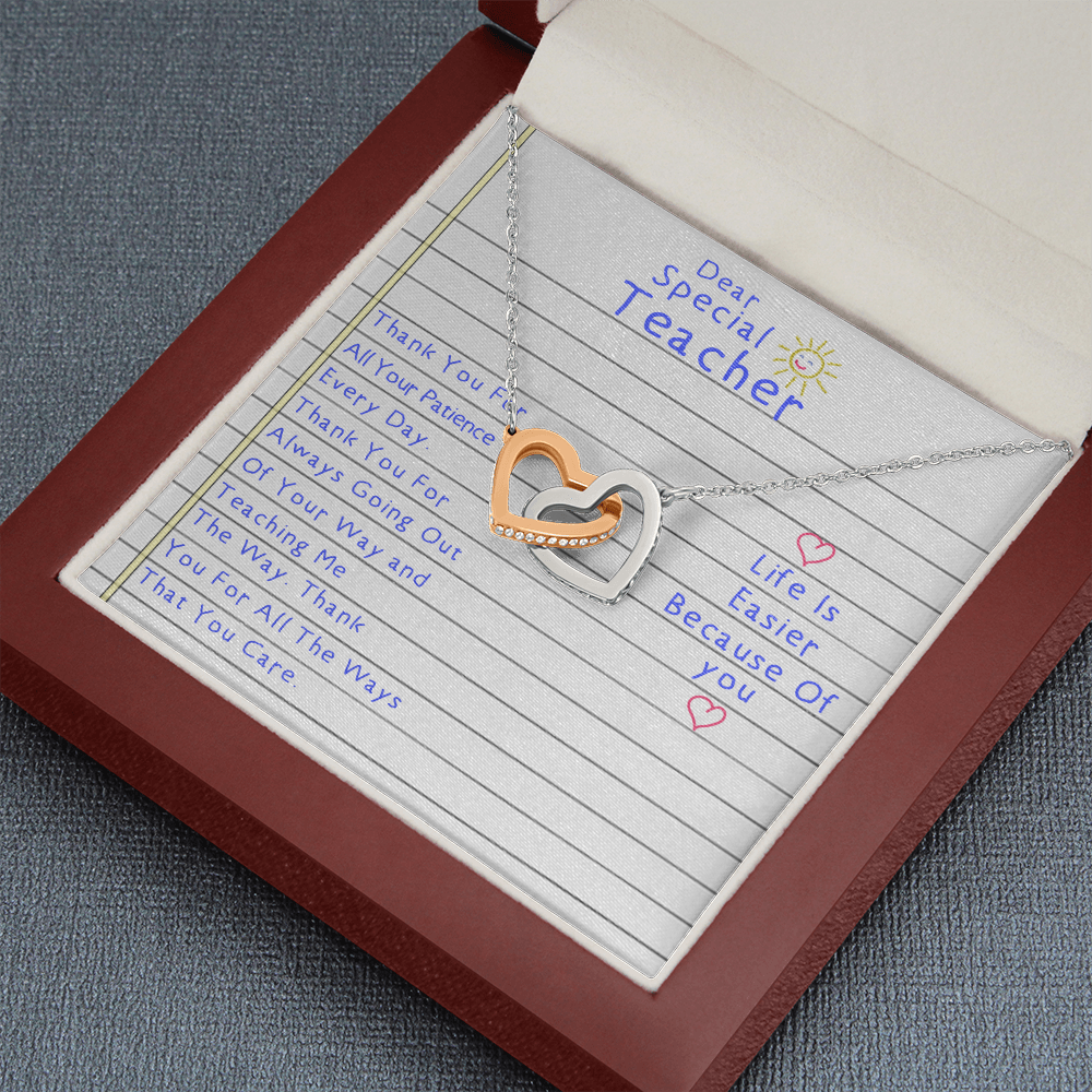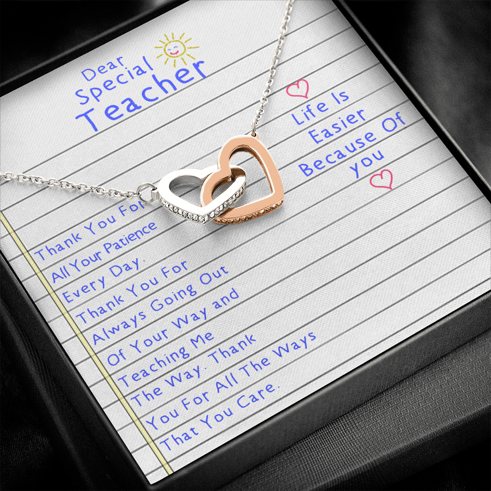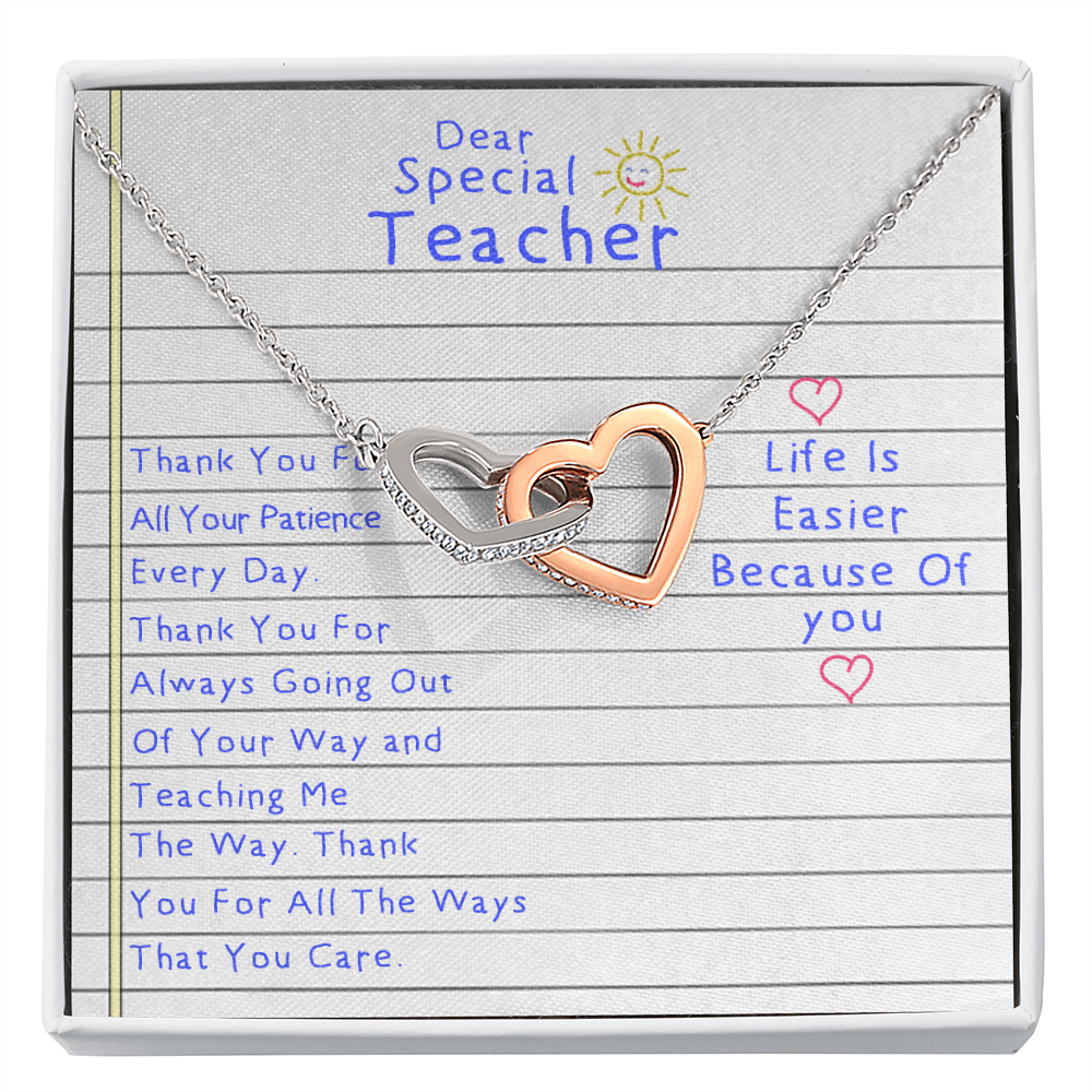 Show appreciation for your special teacher with this interlocking hearts necklace. This dazzling pendant features two hearts crafted with polished stainless steel and rose gold or an 18K yellow gold finish embellished with cubic zirconia crystals. The intertwined hearts represent adoration and unity - an eternal bond between two souls. Surprise them with this perfect and meaningful gift today!