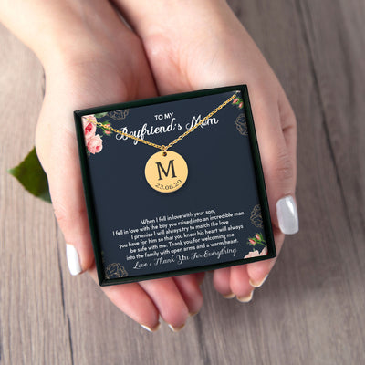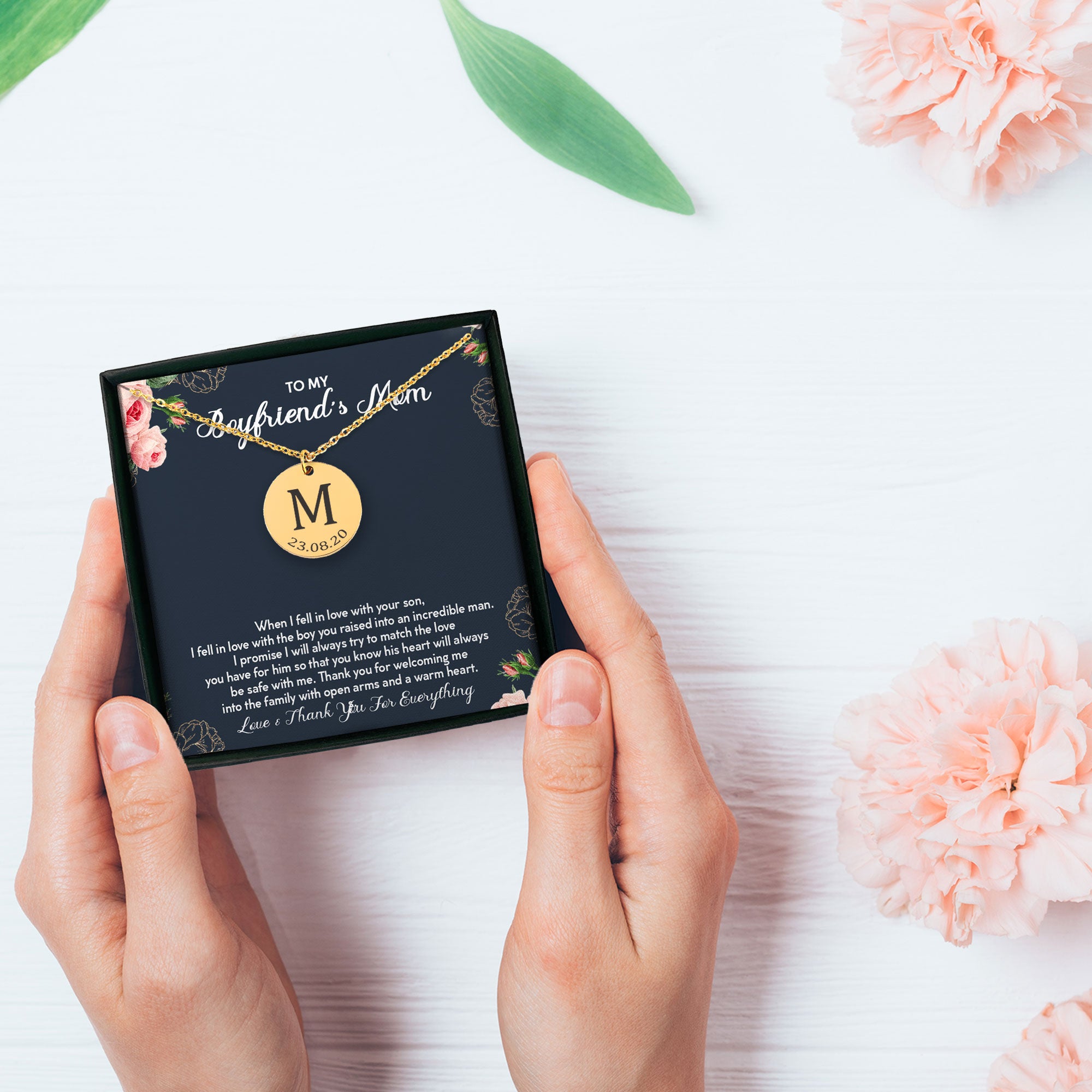 Express love and gratitude to your boyfriend's mom with this personalized name initial necklace. This stainless steel necklace is available in three colors: Gold, Silver, and Rose Gold plating with an engravable pendant with name initial, and birth date.