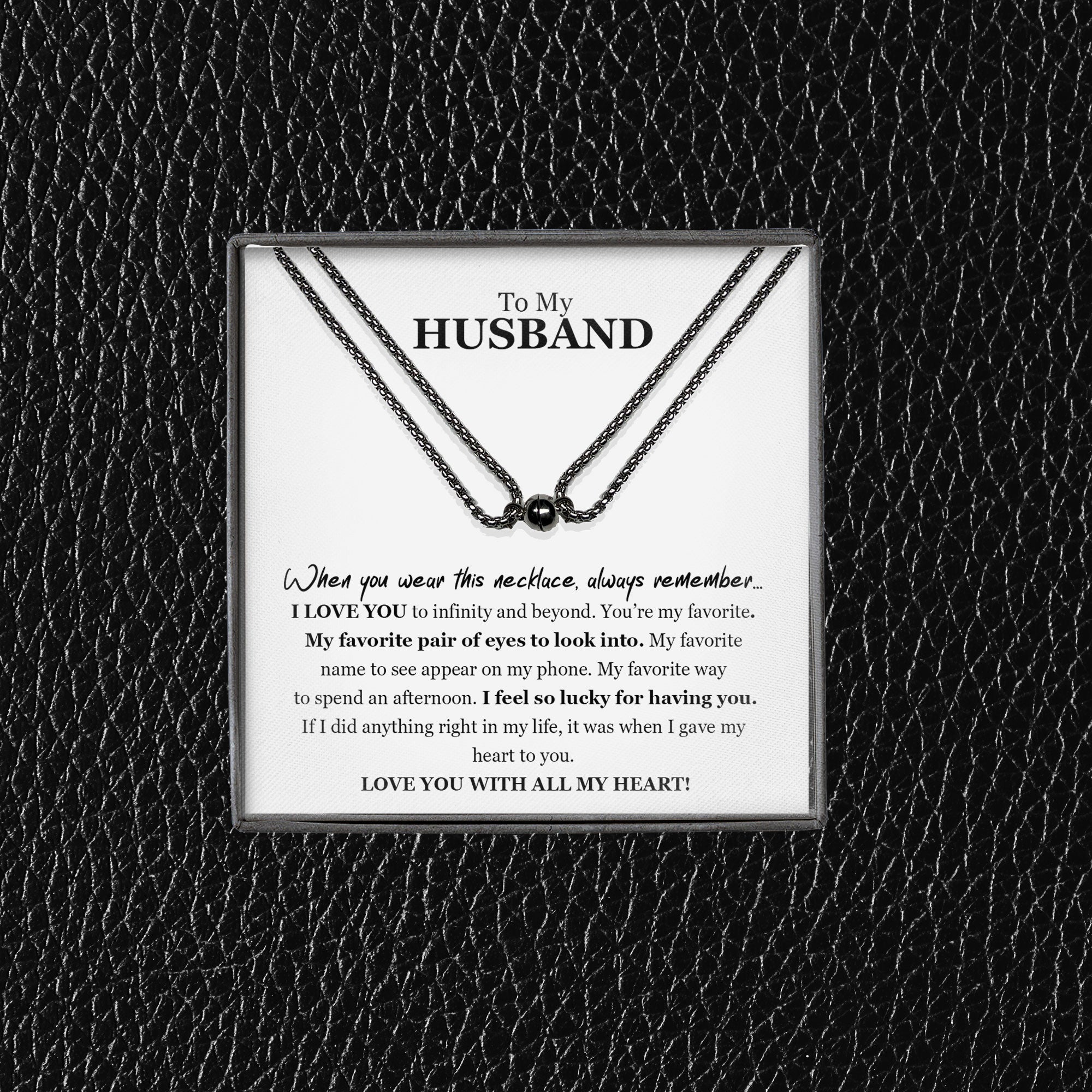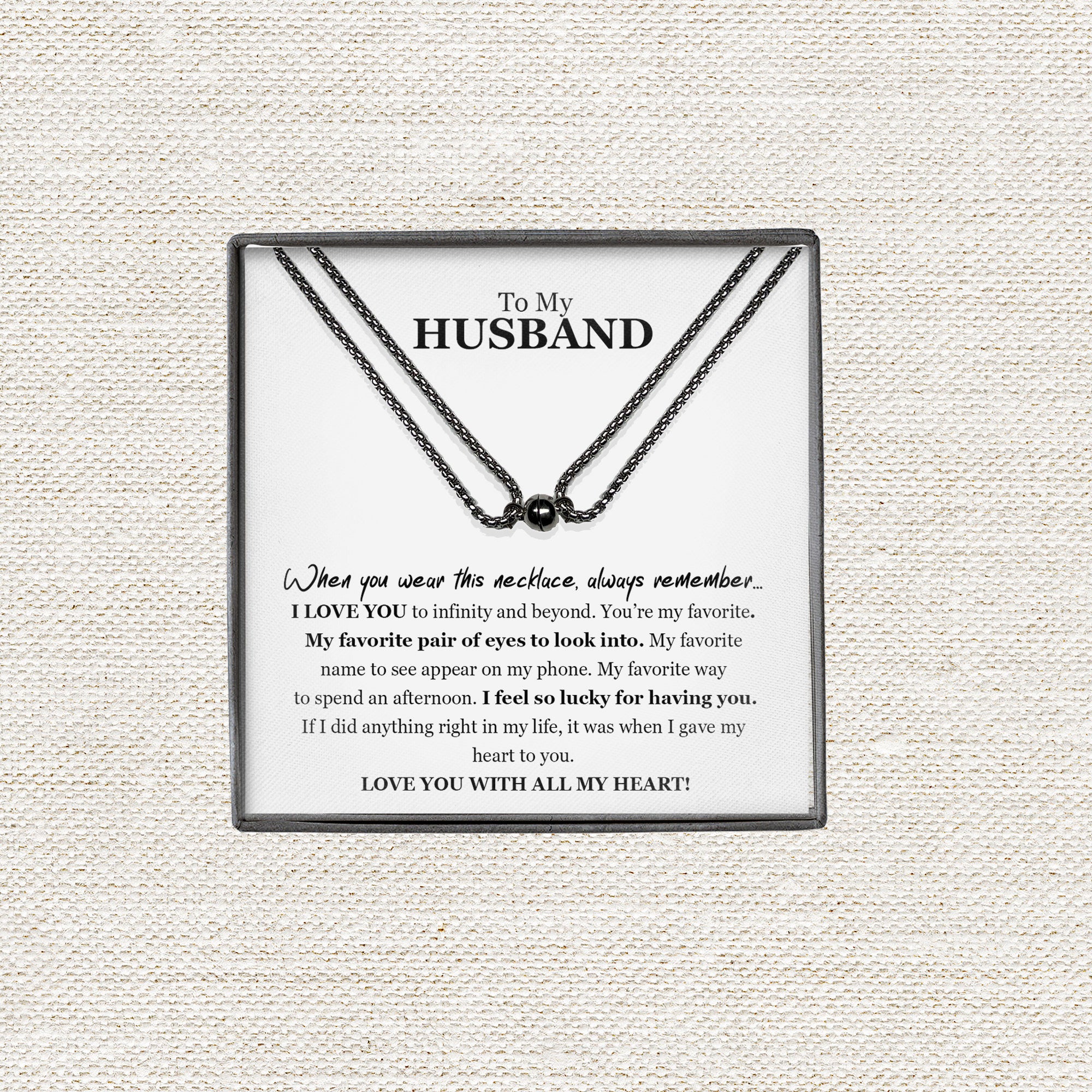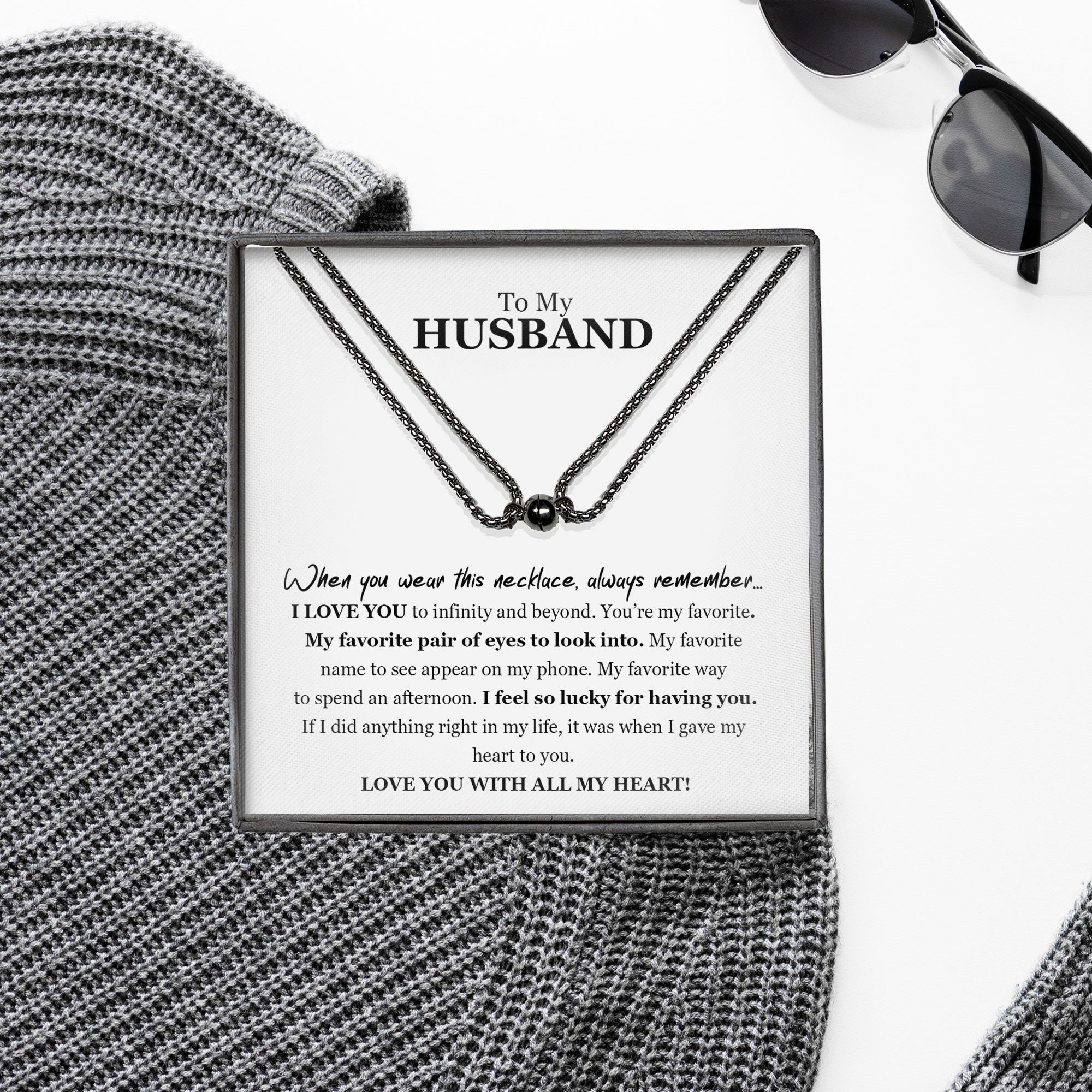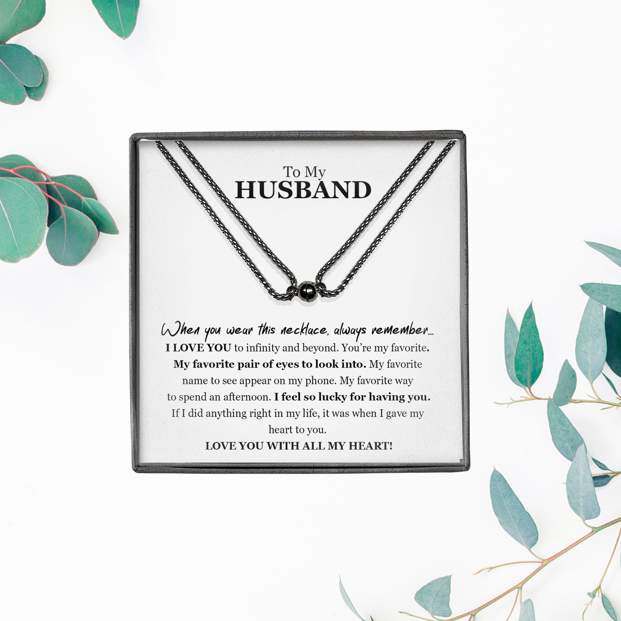 Item reads: TO MY HUSBAND When you wear this necklace always remember... I LOVE YOU to infinity and beyond. You're my favorite. My favorite pair of eyes to into. My favorite name to see appear on my phone. My favorite way to spend an afternoon. I feel so lucky for having you. If I did anything right in my life, it was when I gave my heart to you. LOVE YOU WITH ALL MY HEART!
